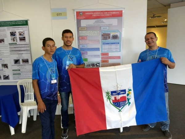 Professor André Pereira e os alunos, da Escola Estadual Cônego José Bulhões, de Dois Riachos, apresentaram protótipo de garagem extensível acionada por controle remoto