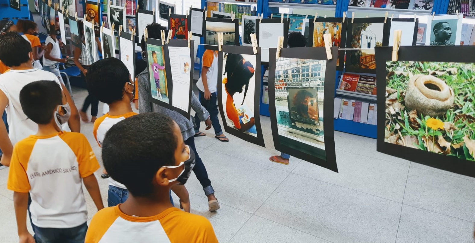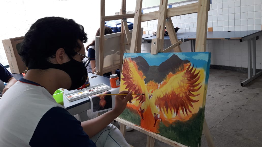 O grupo de estudantes participa do projeto de Artes Visuais na unidade de ensino, onde a exposição está montada.
