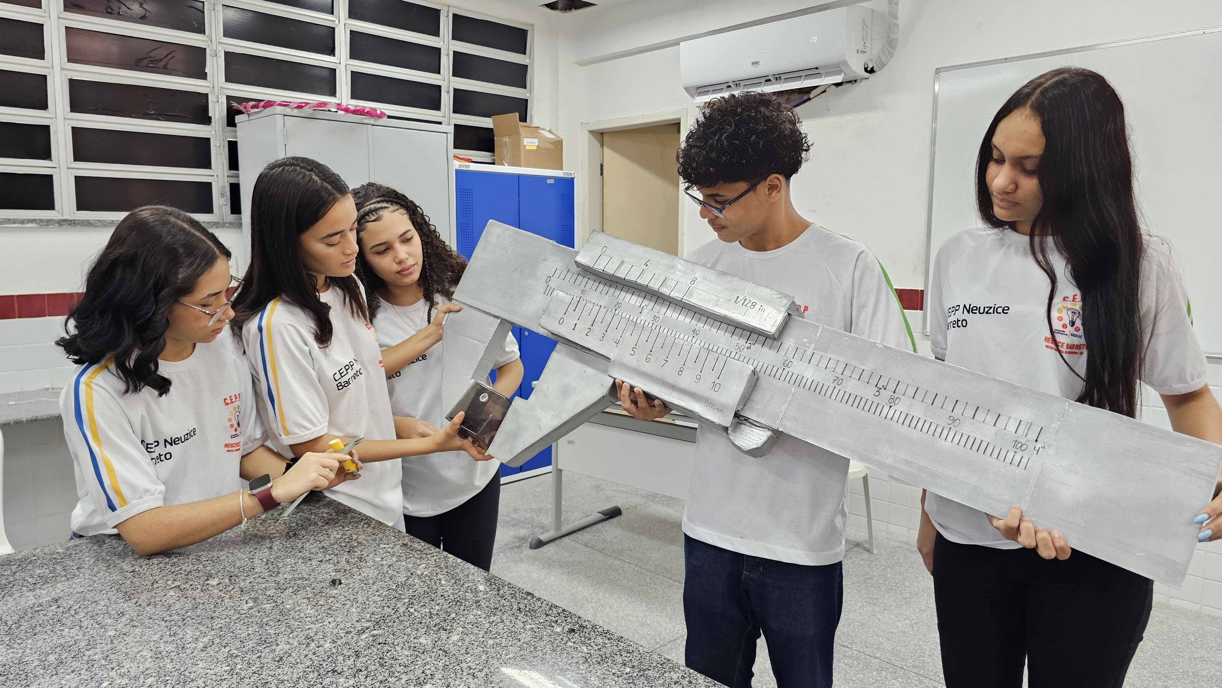 Foram construídos uma régua, um paquímetro e um medidor de nível para ampliar a ilustração dos materiais nas aulas práticas, inclusive uma régua em Braille