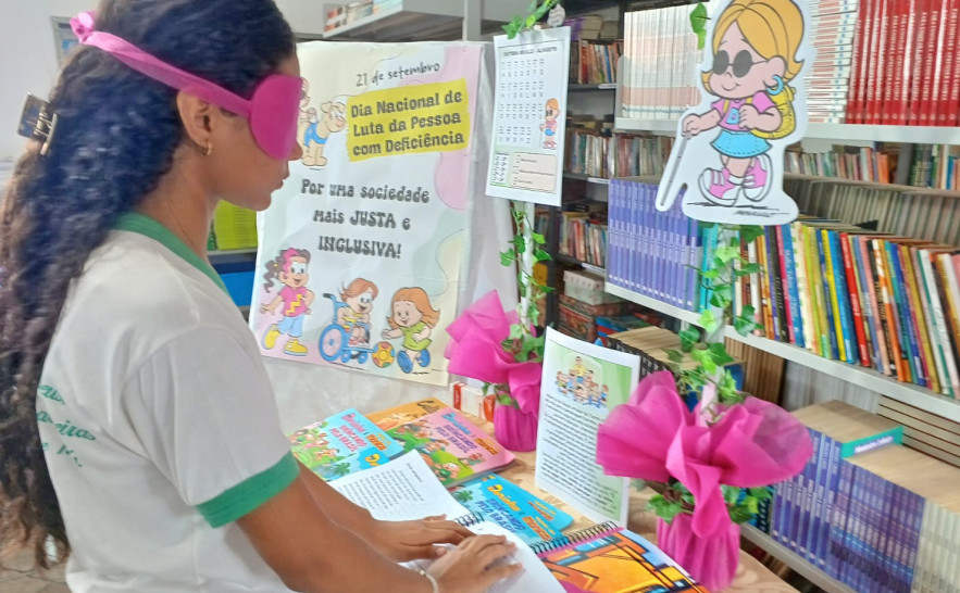 Uma turma de alunos foi à biblioteca conhecer livros e literaturas em Braille para refletir sobre a rotina das pessoas cegas