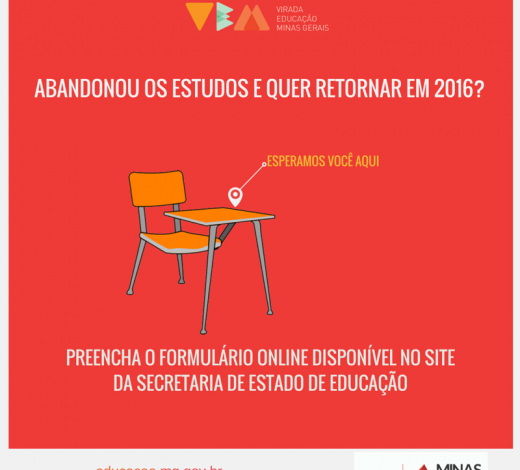O jovem que deixou de estudar e quer retornar aos estudos tem uma oportunidade de programar a sua volta às salas de aula no ano que vem. Teve início no dia 21 de setembro o chamado aos jovens que querem voltar a estudar em 2016 em qualquer nível da Educação Básica em Minas Gerais. A iniciativa da Secretaria de Estado da Educação (SEE) faz parte da Virada Educação Minas Gerais (VEM), movimento que quer criar uma escola sintonizada com a realidade da juventude a partir do envolvimento de toda a comunidade escolar e da sociedade.