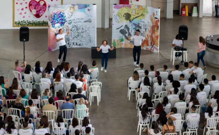 A Secretaria da Educação (Seduc) recebeu, nesta sexta-feira (31), a apresentação de uma esquete teatral que aborda questões relativas ao alcoolismo na adolescência. Estudantes da Escola Estadual de Educação Profissional (EEEP) Comendador Miguel Gurgel assistiram à peça, junto com servidores da Casa. A iniciativa faz parte do Programa Fala Sério, fruto de parceria entre a Seduc, o Instituto Diageo e o Instituto Aliança. Ao todo, 120 escolas serão contempladas pela iniciativa no ano de 2019. O Grupo Bandeira das Artes, parceiro da ação, é responsável pelas apresentações.